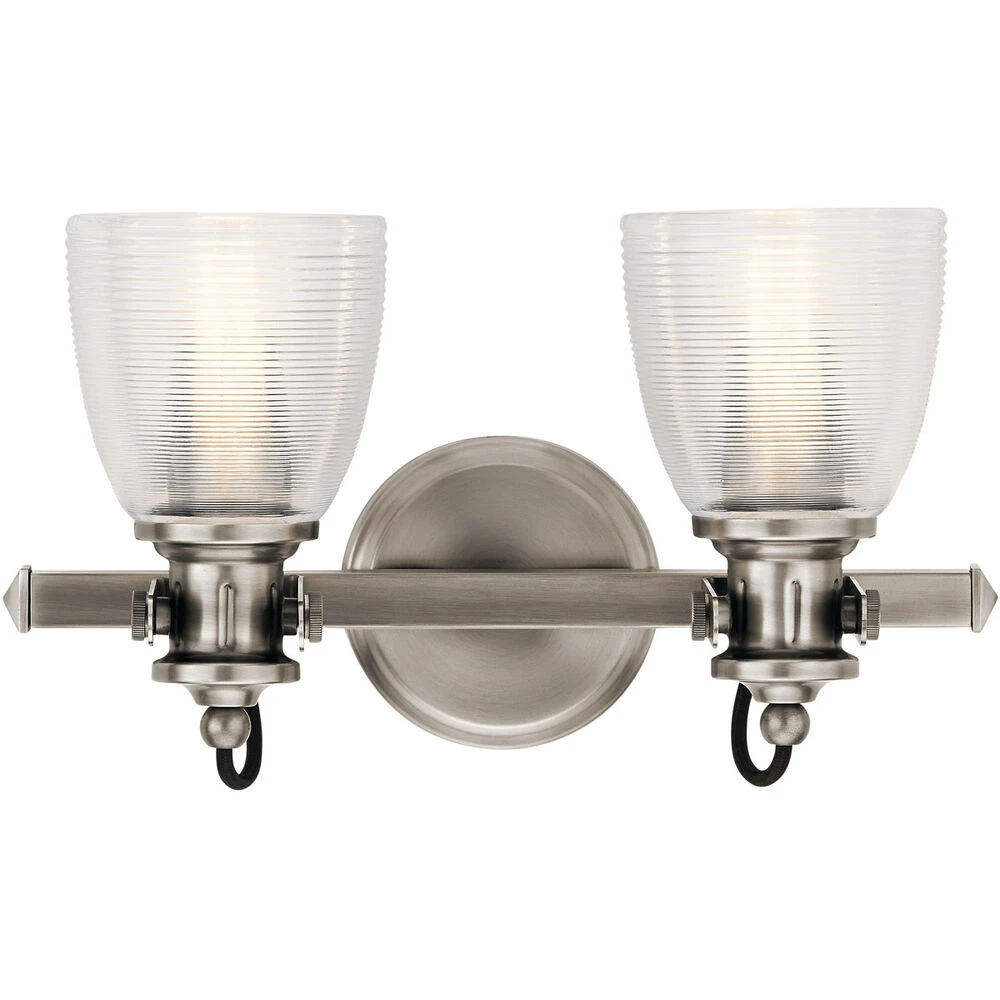 The Flagship(TM) collection 2-light bath light offers a nautical-inspired look that doesn’t overlook the details. Ribbed and textured glass shades, exposed black cords and mechanical supports blend to add interest.